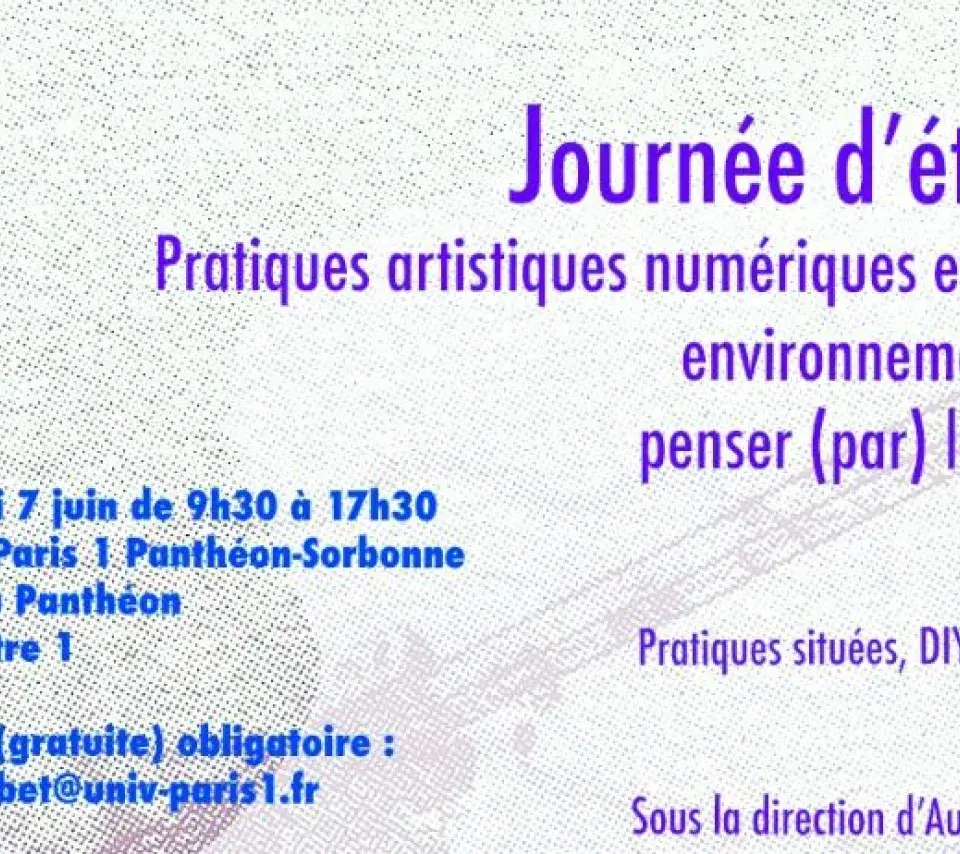 Journée d'étude Image de couverture Le vendredi 7 juin 2024 09h30 17h30 Pratiques artistiques numériques et enjeux environnementaux : penser (par) le milieu Ajouter à mon calendrier