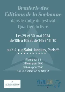 Dans le cadre du festival Quartier du livre du 5e arrondissement, les Éditions de la Sorbonne ont le plaisir de vous proposer une braderie exceptionnelle de leurs ouvrages, disponibles à la librairie du 212, rue Saint-Jacques (Paris 5e), du 29 au 30 mai, de 10 h à 13 h et de 14 h à 17 h 30.
